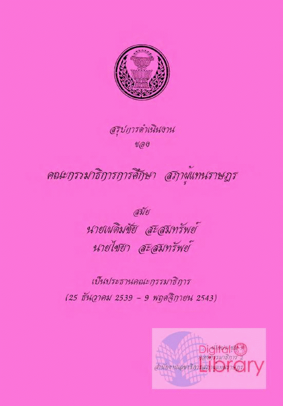 สรุปการดำเนินงานของคณะกรรมาธิการการศึกษา สภาผู้แทนราษฎร สมัยนายเผดิมชัย สะสมทรัพย์ นายไชยา สะสมทรัพย์ เป็นประธานคณะกรรมาธิการ (25 ธันวาคม 2539 - 9 พฤศจิกายน 2543) / กองกรรมาธิการ 2 สำนักงานเลขาธิการสภาผู้แทนราษฎร.
