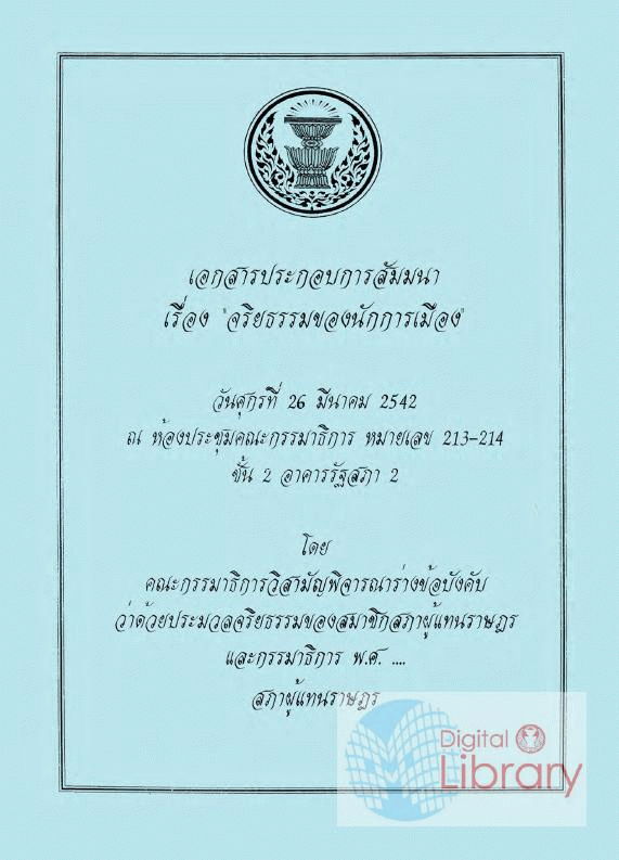 เอกสารประกอบการสัมมนา เรื่อง "จริยธรรมของนักการเมือง" / คณะกรรมาธิการวิสามัญพิจารณาร่างข้อบังคับว่าด้วยประมวลจริยธรรมของสมาชิกสภาผู้แทนราษฎรและกรรมาธิการ.