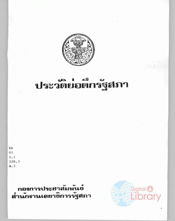 National Assembly Library of Thailand | Parliamentary Publications Collection | Parliamentary Publications Shelves | รภ 01 3.1 328.3 (เรียกดูชั้นหนังสือ(เปิดด้านล่าง)) | ฉ. 3 | พร้อมให้บริการ | 3961145692 | |