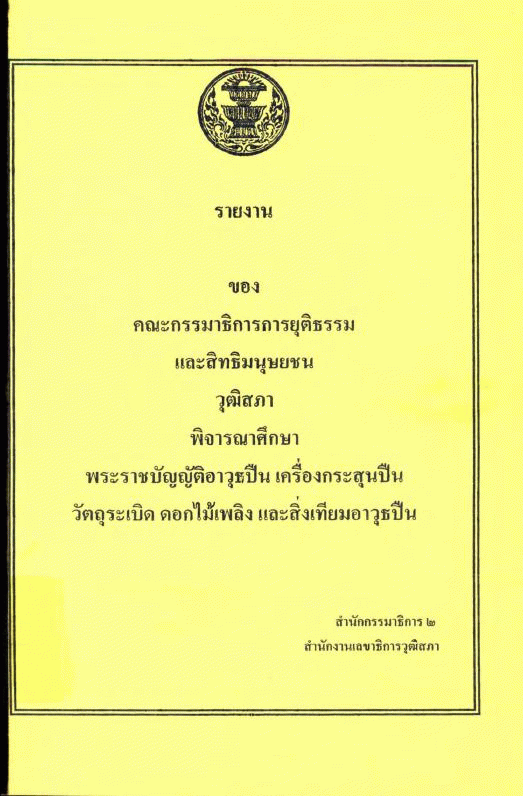 รายงานของคณะกรรมาธิการการยุติธรรมและสิทธิมนุษยชน วุฒิสภา พิจารณาศึกษาพระราชบัญญัติอาวุธปืน เครื่องกระสุนปืน วัตถุระเบิด ดอกไม้เพลิง และสิ่งเทียมอาวุธปืน / สำนักกรรมาธิการ 2 สำนักงานเลขาธิการวุฒิสภา.