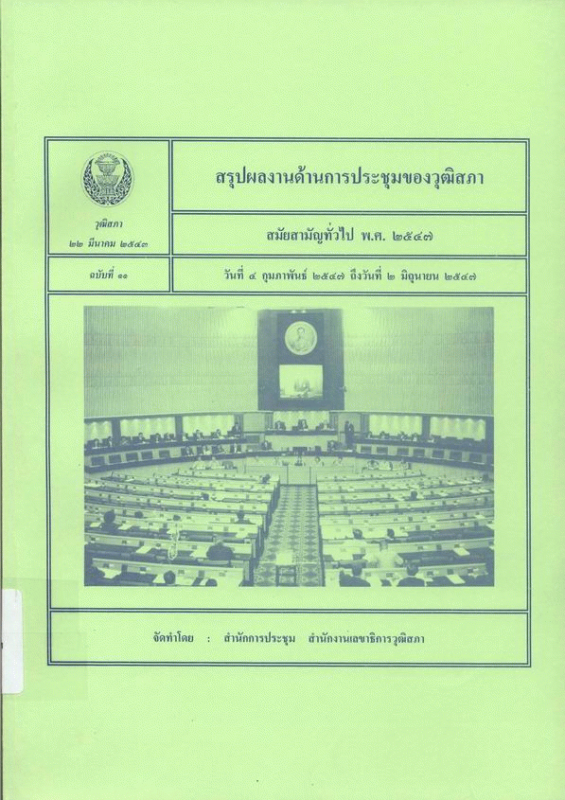 สรุปผลงานด้านการประชุมของวุฒิสภา สมัยสามัญทั่วไป พ.ศ. 2547 วันที่ 4 กุมภาพันธ์ 2547 ถึงวันที่ 2 มิถุนายน 2547 ฉบับที่ 11 / สำนักการประชุม สำนักงานเลขาธิการวุฒิสภา.