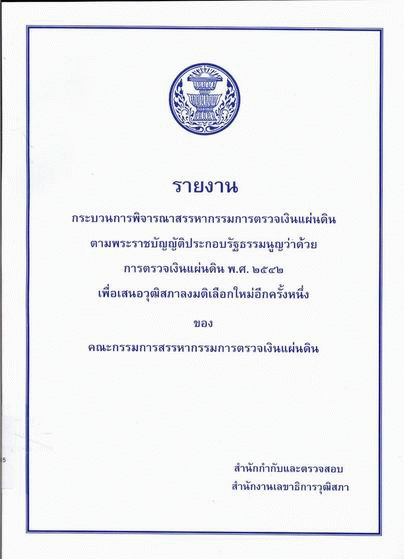 รายงานกระบวนการพิจารณาสรรหากรรมการตรวจเงินแผ่นดินตามพระราชบัญญัติประกอบรัฐธรรมนูญว่าด้วยการตรวจเงินแผ่นดิน พ.ศ. 2542 เพื่อเสนอวุฒิสภาลงมติเลือกใหม่อีกครั้งหนึ่ง ของ คณะกรรมการสรรหากรรมการตรวจเงินแผ่นดิน / สำนักกำกับและตรวจสอบ สำนักงานเลขาธิการวุฒิสภา.
