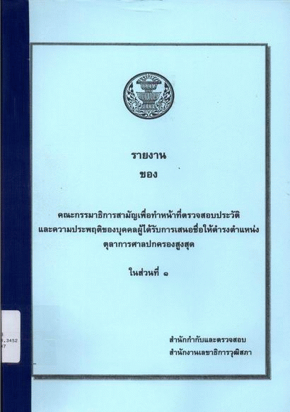 รายงานของคณะกรรมาธิการสามัญเพื่อทำหน้าที่ตรวจสอบประวัติและความประพฤติของบุคคลผู้ได้รับการเสนอชื่อให้ดำรงตำแหน่งตุลาการศาลปกครองสูงสุด ในส่วนที่ 1 / สำนักกำกับและตรวจสอบ สำนักงานเลขาธิการวุฒิสภา.