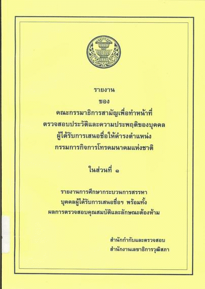 รายงานของคณะกรรมาธิการสามัญ เพื่อทำหน้าที่ตรวจสอบประวัติและความประพฤติของบุคคลผู้ได้รับการเสนอชื่อให้ดำรงตำแหน่งกรรมการกิจการโทรคมนาคมแห่งชาติในส่วนที่ 1 รายงานการศึกษากระบวนการสรรหาบุคคลผู้ได้รับการเสนอชื่อฯ พร้อมทั้งผลการตรวจสอบคุณสมบัติและลักษณะต้องห้าม / สำนักกำกับและตรวจสอบ สำนักงานเลขาธิการวุฒิสภา.