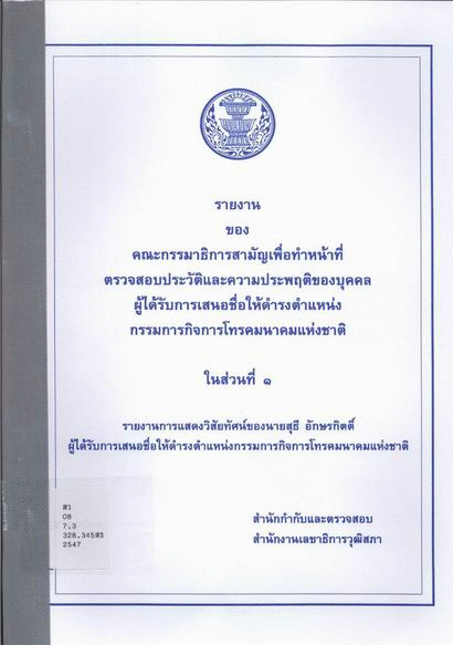 รายงานของคณะกรรมาธิการสามัญเพื่อทำหน้าที่ตรวจสอบประวัติและความประพฤติของบุคคลผู้ได้รับการเสนอชื่อให้ดำรงตำแหน่งกรรมการกิจการโทรคมนาคมแห่งชาติ ในส่วนที่ 1 รายงานการแสดงวิสัยทัศน์ของนายสุธี อักษรกิตติ์ ผู้ได้รับการเสนอชื่อให้ดำรงตำแหน่งกรรมการกิจการโทรคมนาคม / สำนักกำกับและตรวจสอบ สำนักงานเลขาธิการวุฒิสภา.