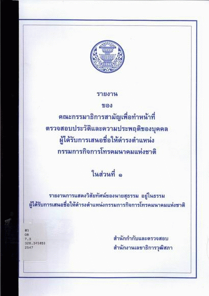 รายงานของคณะกรรมาธิการสามัญเพื่อทำหน้าที่ตรวจสอบประวัติและความประพฤติของบุคคลผู้ได้รับการเสนอชื่อให้ดำรงตำแหน่งกรรมการกิจการโทรคมนาคมแห่งชาติ ในส่วนที่ 1 รายงานการแสดงวิสัยทัศน์ของนายสุธรรม อยู่ในธรรม ผู้ได้รับการเสนอชื่อให้ดำรงตำแหน่งกรรมการกิจการโทรคมนาคม / สำนักกำกับและตรวจสอบ สำนักงานเลขาธิการวุฒิสภา.