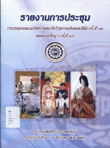 รายงานการประชุมคณะมนตรีสหภาพสมาชิกรัฐสภาเอเซียและแปซิฟิก ครั้งที่ 70 และสมัชชาใหญ่ฯ ครั้งที่ 36 ณ กรุงโตเกียว ประเทศญี่ปุ่น ระหว่างวันที่ 1-5 ธันวาคม พ.ศ. 2546 / สำนักองค์การรัฐสภาระหว่างประเทศ สำนักงานเลขาธิการสภาผู้แทนราษฎร.