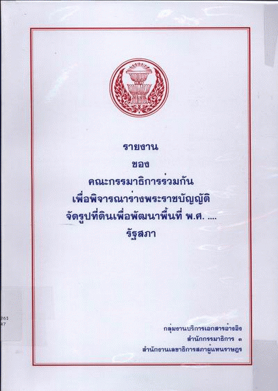 - ร่างพระราชบัญญัติจัดรูปที่ดินเพื่อพัฒนาพื้นที่ที่ดิน -- กฎหมายและระเบียบข้อบังคับการจัดรูปที่ดิน -- กฎหมายและระเบียบข้อบังคับ