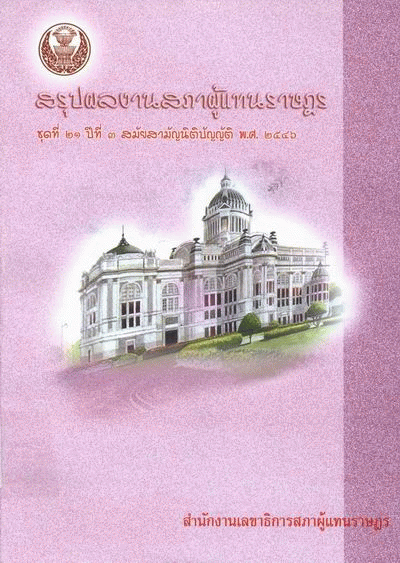 สรุปผลงานสภาผู้แทนราษฎร ชุดที่ 21 ปีที่ 3 สมัยสามัญนิติบัญญัติ พ.ศ. 2546 / สำนักประชาสัมพันธ์ สำนักงานเลขาธิการสภาผู้แทนราษฎร.