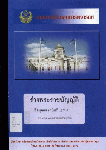 National Assembly Library of Thailand | Parliamentary Publications Collection | Parliamentary Publications Shelves | สผ 12 5.4 346.012 2547 (เรียกดูชั้นหนังสือ(เปิดด้านล่าง)) | พร้อมให้บริการ | 3961153491 |