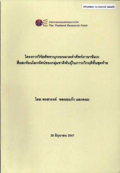 โครงการวิจัยศัพทานุกรมหมวดคำศัพท์ภาษาซัมเร : สื่อสะท้อนโลกทัศน์ของกลุ่มชาติพันธุ์ในภาวะวิกฤติขั้นสุดท้าย / พรสวรรค์ พลอยแก้ว และคณะ