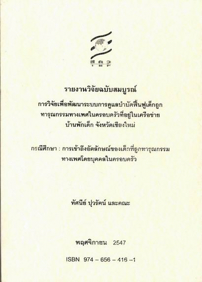 การวิจัยเพื่อพัฒนาระบบการดูแลบำบัดฟื้นฟูเด็กถูกทารุณกรรมทางเพศในครอบครัวที่อยู่ในเครือข่ายบ้านพักเด็ก จังหวัดเชียงใหม่ กรณีศึกษา : การเข้าถึงอัตลักษณ์ของเด็กที่ถูกทารุณกรรมทางเพศ โดยบุคคลในครอบครัว / ทัศนีย์ ปุวรัตน์ และคณะ