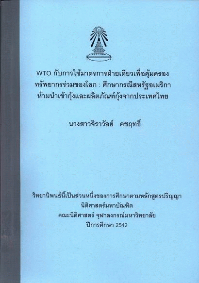 WTO กับการใช้มาตรการฝ่ายเดียวเพื่อคุ้มครองทรัพยากรร่วมของโลก : ศึกษากรณีสหรัฐอเมริกาห้ามนำเข้ากุ้งและผลิตภัณฑ์จากกุ้งจากประเทศไทย / จิราวัลย์ คชฤทธิ์