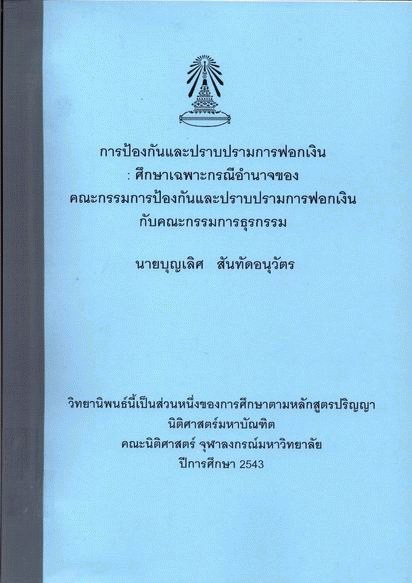 กฎหมายป้องกันและปราบปรามการฟอกเงิน : ศึกษาเฉพาะกรณีอำนาจของคณะกรรมการป้องกันและปราบปรามการฟอกเงินกับคณะกรรมการธุรกรรม / บุญเลิศ สันทัดอนุวัตร