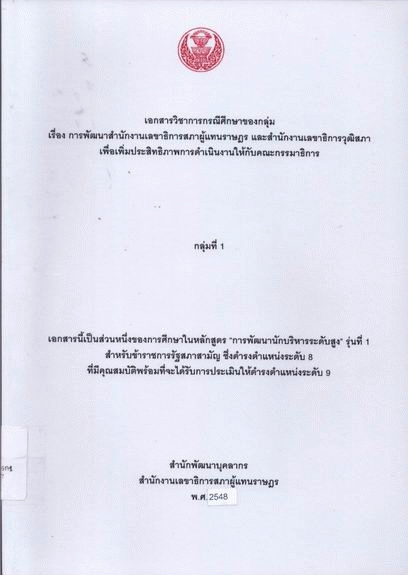 การพัฒนาสำนักงานเลขาธิการสภาผู้แทนราษฎร และสำนักงานเลขาธิการวุฒิสภาเพื่อเพิ่มประสิทธิภาพการดำเนินงานให้กับคณะกรรมาธิการ : เอกสารวิชาการกรณีศึกษาของกลุ่ม [กลุ่มที่ 1] / สำนักพัฒนาบุคลากร สำนักงานเลขาธิการสภาผู้แทนราษฎร,