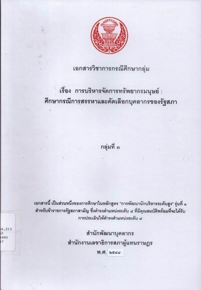 การบริหารจัดการทรัพยากรมนุษย์ : ศึกษากรณีการสรรหาและคัดเลือกบุคลากรของรัฐสภา : เอกสารวิชาการกรณีศึกษากลุ่ม [กลุ่มที่ 3] / สำนักพัฒนาบุคลากร สำนักงานเลขาธิการสภาผู้แทนราษฎร,