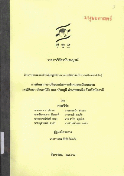 การศึกษาการเปลี่ยนแปลงทางสังคมและวัฒนธรรม กรณีศึกษาบ้านดาโต๊ะและบ้านภูมี อำเภอยะหริ่ง จังหวัดปัตตานี / ดอเลาะ เจ๊ะแต ... [และคนอื่น ๆ]