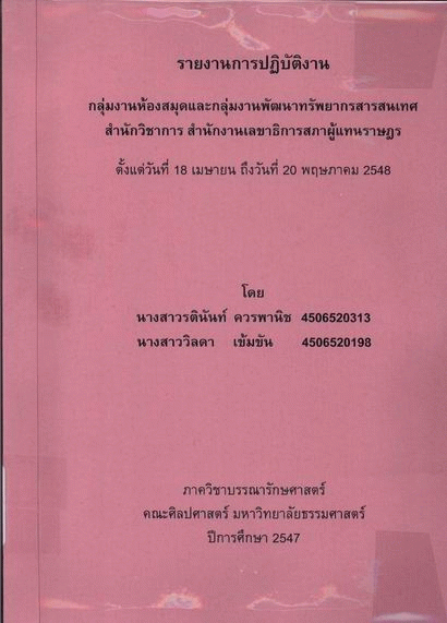 รายงานการปฏิบัติงาน กลุ่มงานห้องสมุดและกลุ่มงานพัฒนาทรัพยากรสารสนเทศ สำนักวิชาการ สำนักงานเลขาธิการสภาผู้แทนราษฎร ตั้งแต่วันที่ 18 เมษายน ถึงวันที่ 20 พฤษภาคม 2548