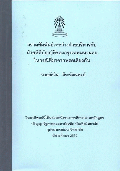 ความสัมพันธ์ระหว่างฝ่ายบริหารกับฝ่ายนิติบัญญัติของกรุงเทพมหานครในกรณีที่มาจากพรรคเดียวกัน / อัศวิน ตีระวัฒนพงษ์