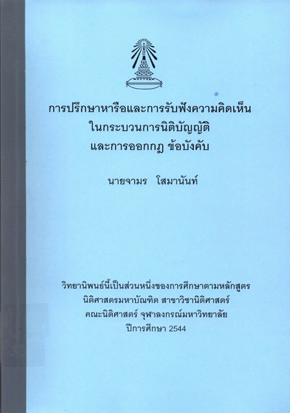 การปรึกษาหารือและการรับฟังความคิดเห็นในกระบวนการนิติบัญญัติและการออกกฎ ข้อบังคับ / จามร โสมานันท์.