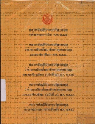 พระราชบัญญัติประกอบรัฐธรรมนูญว่าด้วยพรรคการเมือง พ.ศ. 2541 พระราชบัญญัติประกอบรัฐธรรมนูญว่าด้วยการเลือกตั้งสมาชิกสภาผู้แทนราษฎรและสมาชิกวุฒิสภา พ.ศ. 2541 พระราชบัญญัติประกอบรัฐธรรมนูญว่าด้วย... / สำนักงานเลขาธิการสภาผู้แทนราษฎร.