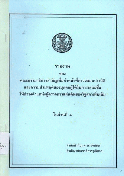 รายงานของคณะกรรมาธิการสามัญเพื่อทำหน้าที่ตรวจสอบประวัติและความประพฤติของบุคคลผู้ได้รับการเสนอชื่อให้ดำรงตำแหน่งผู้ตรวจการแผ่นดินของรัฐสภา เพิ่มเติมในส่วนที่ 1 / สำนักกำกับและตรวจสอบ สำนักงานเลขาธิการวุฒิสภา.