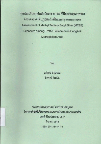 การประเมินการรับสัมผัสสาร MTBE ที่มีผลต่อสุขภาพของตำรวจจราจรที่ปฏิบัติหน้าที่ในเขตกรุงเทพมหานคร = Assessment of Methyl Tertiary Butyl Ether (MTBE) exposure among traffic policemen in Bangkok metropolitan are ศรีรัตน์ ล้อมพงศ์