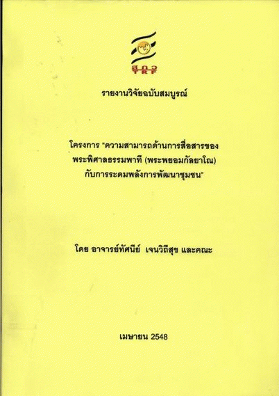 โครงการ "ความสามารถด้านการสื่อสารของพระพิศาลธรรมพาที (พระพยอม กัลยาโณ) กับการระดมพลังการพัฒนาชุมชน" (รายงานวิจัยฉบับสมบูรณ์) / ทัศนีย์ เจนวิถีสุข และคณะ.