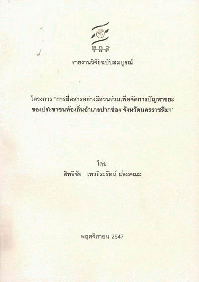 การสื่อสารอย่างมีส่วนร่วมเพื่อจัดการปัญหาขยะของประชาชนท้องถิ่นอำเภอปากช่อง จังหวัดนครราชสีมา (รายงานวิจัยฉบับสมบูรณ์) / สิทธิชัย เทวธีรรัตน์ และคณะ.