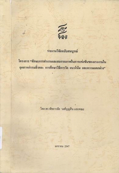 โครงการ "ทักษะการทำงานและสมรรถภาพในการแข่งขันของแรงงานในอุตสาหกรรมสิ่งทอ : การศึกษาวิธีการวัด แนวโน้ม และความแตกต่าง" / พัชราวลัย วงศ์บุญสิน และคณะ.