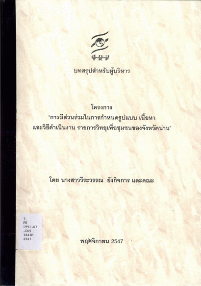 การมีส่วนร่วมในการกำหนดรูปแบบ เนื้อหา และวิธีดำเนินงานรายการวิทยุเพื่อชุมชนของจังหวัดน่าน (บทสรุปสำหรับผู้บริหาร) / วีระวรรณ ยังกิจการ และคณะ
