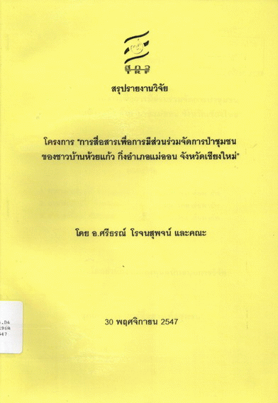 โครงการ "การสื่อสารเพื่อการมีส่วนร่วมจัดการป่าชุมชนของชาวบ้านห้วยแก้ว กิ่งอำเภอแม่ออน จังหวัดเชียงใหม่" (สรุปรายงานวิจัย) / โดย ศรีธรณ์ โรจนสุพจน์... [และคนอื่น ๆ]