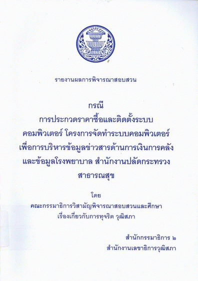 รายงานผลการพิจารณาสอบสวนกรณีการประกวดราคาซื้อและติดตั้งระบบคอมพิวเตอร์โครงการจัดทำระบบคอมพิวเตอร์เพื่อการบริหารข้อมูลข่าวสารด้านการเงินการคลังและข้อมูลโรงพยาบาล สำนักงานปลัดกระทรวงสาธารณสุข โดยคณะกรรมาธิการวิสามัญพิจารณาสอบสวนและศึกษาเรื่องเกี่ยวกับการทุจริต / สำนักกรรมาธิการ 2 สำนักงานเลขาธิการวุฒิสภา.