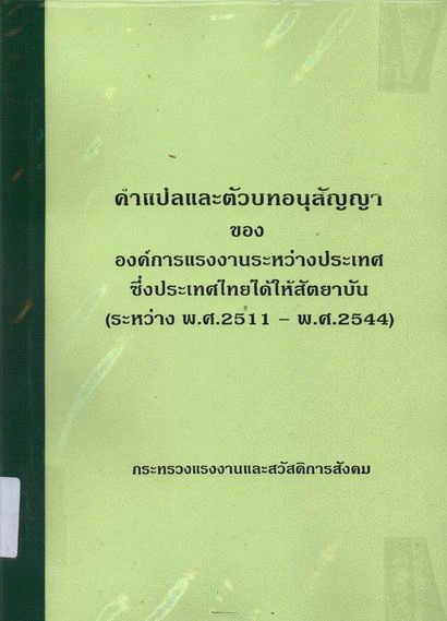 คำแปลและตัวบทอนุสัญญาขององค์การแรงงานระหว่างประเทศ ซึ่งประเทศไทยได้ให้สัตยาบัน (ระหว่าง พ.ศ. 2511 - พ.ศ. 2544) / กระทรวงแรงงานและสวัสดิการสังคม.