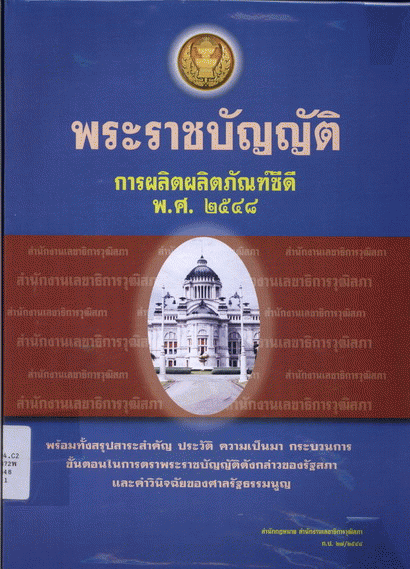 พระราชบัญญัติการผลิตผลิตภัณฑ์ซีดี พ.ศ. 2548 พร้อมทั้งสรุปสาระสำคัญ ประวัติ ความเป็นมา กระบวนการ ขั้นตอนในการตราพระราชบัญญัติดังกล่าวของรัฐสภา และคำวินิจฉัยของศาลรัฐธรรมนูญ / สำนักกฎหมาย สำนักงานเลขาธิการวุฒิสภา.