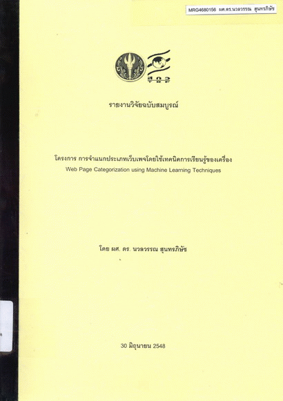 TextLanguage: thaeng Publisher: กรุงเทพฯ : สำนักงานกองทุนสนับสนุนการวิจัย, 2548Description: 61 หน้า : ตาราง ; 29 ซมOther title: - Web page categorization using machine learning techniques
