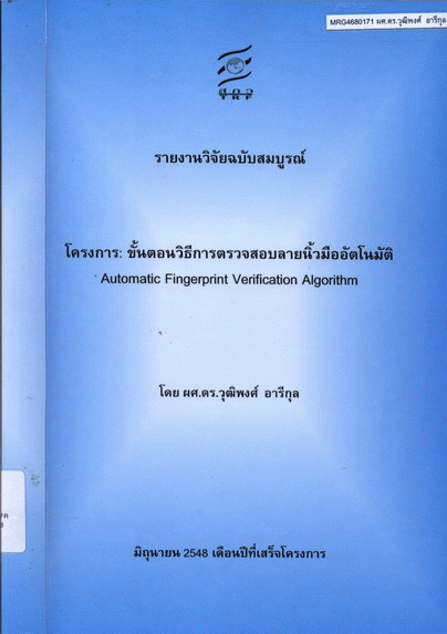 โครงการ : ขั้นตอนวิธีการตรวจสอบลายนิ้วมืออัตโนมัติ = Automatic fingerprint verification algorithm / วุฒิพงศ์ อารีกุล.
