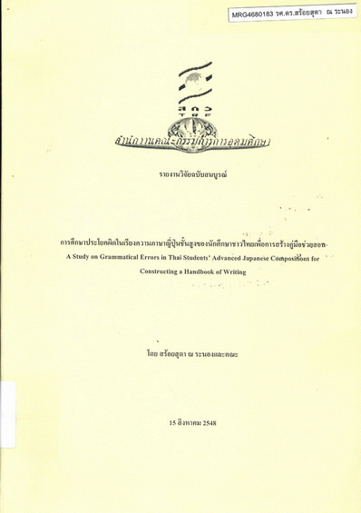 การศึกษาประโยคผิดในเรียงความภาษาญี่ปุ่นชั้นสูงของนักศึกษาชาวไทยเพื่อการสร้างคู่มือช่วยสอน = A study on grammatical errors in thai students'Advanced Japanese compositions for constructing a handbook of writing / สร้อยสุดา ณ ระนอง และคณะ