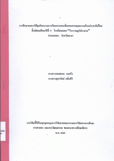 การศึกษาผลการใช้ชุดกิจกรรมการเรียนการสอนที่สอดแทรกคุณธรรมด้านประชาธิปไตย ชั้นมัธยมศึกษาปีที่ 5 โรงเรียนเบตง "วีระราษฎร์ประสาน" อำเภอเบตง จังหวัดยะลา / กมลชนก คงแก้ว, สุภารัตน์ กลั่นศิริ.