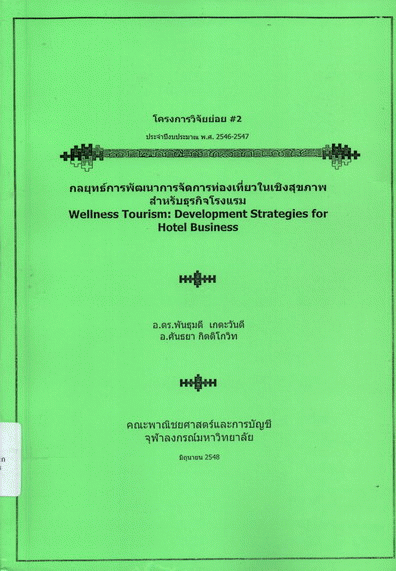 กลยุทธ์การพัฒนาการจัดการท่องเที่ยวในเชิงสุขภาพสำหรับธุรกิจโรงแรม = Wellness Tourism : development strategies for hotel business / พันธุมดี เกตะวันดี, ศันธยา กิตติโกวิท.