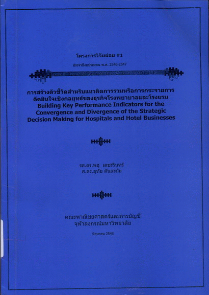 การสร้างตัวชี้วัดสำหรับแนวคิดการรวมหรือการกระจายการตัดสินใจเชิงกลยุทธ์ของธุรกิจโรงพยาบาลและโรงแรม = Building key performance indicators for the convergence and divergence of the strategic decision making for hospitals and hotel businesses / พสุ เดชะรินทร์, อุทัย ตันละมัย.