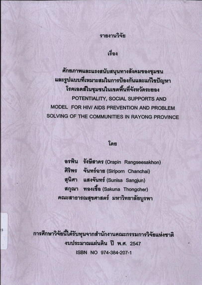 ศักยภาพและแรงสนับสนุนทางสังคมของชุมชนและรูปแบบที่เหมาะสมในการป้องกันและแก้ไขปัญหาโรคเอดส์ในชุมชนในเขตพื้นที่จังหวัดระยอง / อรพิน รังษีสาคร...[และคนอื่น ๆ]