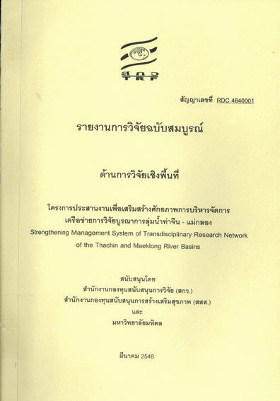 โครงการประสานงานเพื่อเสริมสร้างศักยภาพการบริหารจัดการเครือข่ายการวิจัยบูรณาการลุ่มน้ำท่าจีน-แม่กลอง : ด้านการวิจัยเชิงพื้นที่ = Strengthening management system of transdisciplinary research network of the Thachin and Macklong River Basins.