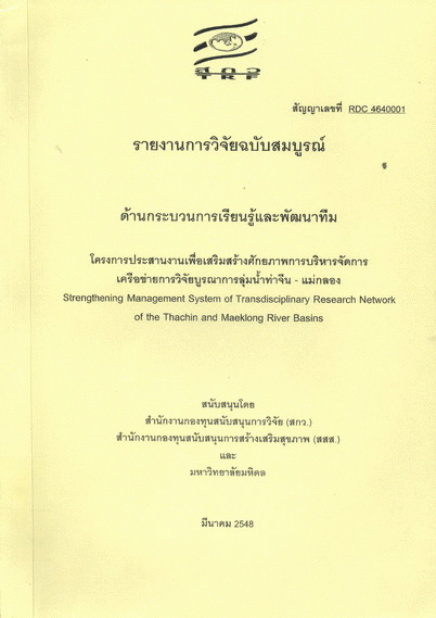 โครงการประสานงานเพื่อเสริมสร้างศักยภาพการบริหารจัดการเครือข่ายการวิจัยบูรณาการลุ่มน้ำท่าจีน-แม่กลอง : ด้านกระบวนการเรียนรู้และพัฒนาทีม = Strengthening management system of transdisciplinary research network of the Thachin and Macklong River Basins.