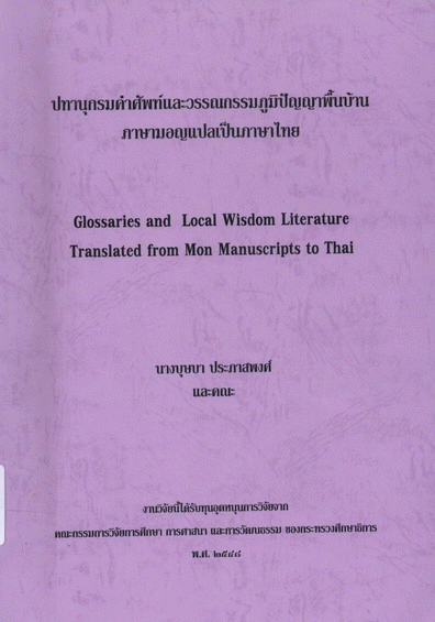 ปทานุกรมคำศัพท์และวรรณกรรมภูมิปัญญาพื้นบ้านภาษามอญแปลเป็นภาษาไทย = Glossaries and local wisdom literature translated from mon manuscrips to Thai / บุษบา ประภาสพงศ์ และคณะ.