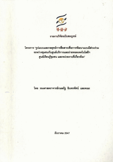 รูปแบบและกลยุทธ์การสื่อสารเพื่อการพัฒนาแบบมีส่วนร่วมระหว่างชุมชนกับศูนย์บริการและถ่ายทอดเทคโนโลยีฯ ศูนย์เรียนรู้ชุมชน และหน่วยงานที่เกี่ยวข้อง / กมลรัฐ อินทรทัศน์ และคณะ