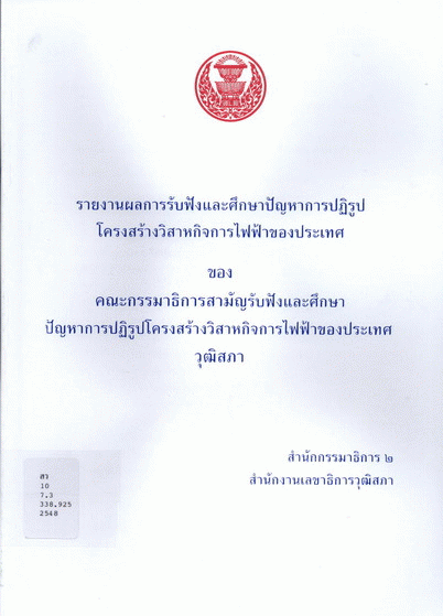 รายงานผลการรับฟังและศึกษาปัญหาการปฏิรูปโครงสร้างวิสาหกิจการไฟฟ้าของประเทศ ของคณะกรรมาธิการสามัญรับฟังและศึกษาปัญหาการปฏิรูปโครงสร้างวิสาหกิจการไฟฟ้าของประเทศ วุฒิสภา / สำนักกรรมาธิการ 2 สำนักงานเลขาธิการวุฒิสภา.
