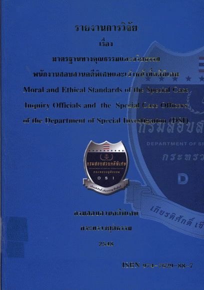 มาตรฐานทางคุณธรรมจริยธรรมพนักงานสอบสวนคดีพิเศษและเจ้าหน้าที่คดีพิเศษ = Moral and ethical standards of the special case in quiry officials and the special case officers of the department of special investigation (DSI) / ศรีปริญญา ธูปกระจ่าง.