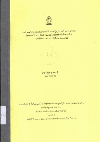 การนำเทคโนโลยีสารสนเทศมาใช้ในการปฏิรูปการบริหารงานภาครัฐ ศึกษากรณี : การนำวิธีการประมูลด้วยระบบอิเล็กทรอนิกส์มาใช้ในกระบวนการจัดซื้อจัดจ้างภาครัฐ / วิทวัส สุนทรมณี.