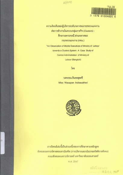 ความคิดเห็นของผู้บริหารระดับกลางของกระทรวงแรงงานต่อการทำงานในระบบกลุ่มภารกิจ (Clusters) : ศึกษาเฉพาะกรณีส่วนกลางของกระทรวงแรงงาน (กทม.) / วสพรรณ อินทรสุขศรี.